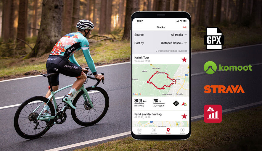 Csatlakoztasd a ROX 2.0-t a Komoot alkalmazáshoz, és hagyd okostelefonod a zsebedben. Ezután részletes turn-by-turn navigációt ad a ROX 2.0 Komoot alkalmazásából, amely nyíl iránymutatóként jeleníthető meg a kijelzőn vagy a Vörös Körön belül. Ez a kör a kijelzőn színesen van kiemelve, és a következő fordulópontok távolságát színes sávként jeleníti meg, amely a fordulópont közeledtével rövidül de mellette megjeleníti a hátralévő távolságot méterben is.