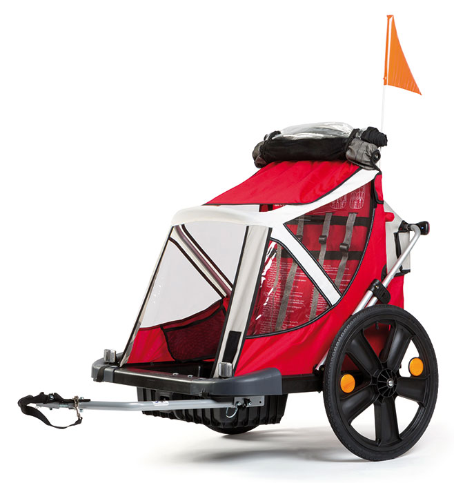 Gyermekszállító utánfutó. A kerékpárhoz dupla biztonsági rendszerrel rögzíthető. Két gyermek szállítására alkalmas, 5 pontos biztonsági övvel. Kemény műanyag alváz, kiemelt védelem a felverődő kövek és az úthibákból adódó sérülések ellen. Vízálló borítás. Nyitható tető, védőhálós betéttel. Jól kihasználható, tágas hátsó tároló zseb. 20”-os, gyorskioldós kerekek, egyszerűen használható parkoló fék. Fényvisszaverő rátétek, zászló és beépített villogó növelik a láthatóságot. Könnyen összecsukható, így kis helyen is tárolható. Maximális teherbírás: 35 kg, legfeljebb 110 cm magas gyermekek részére.